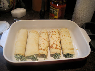 Then I took a jar of pasta sauce - look, there's mine, it was Classico Tomato and Basil - and pour about half of it over your plump and lovingly rolled babies. Five pancakes, in my case, gave us enough dinner to fill two people and still have leftovers for lunch.