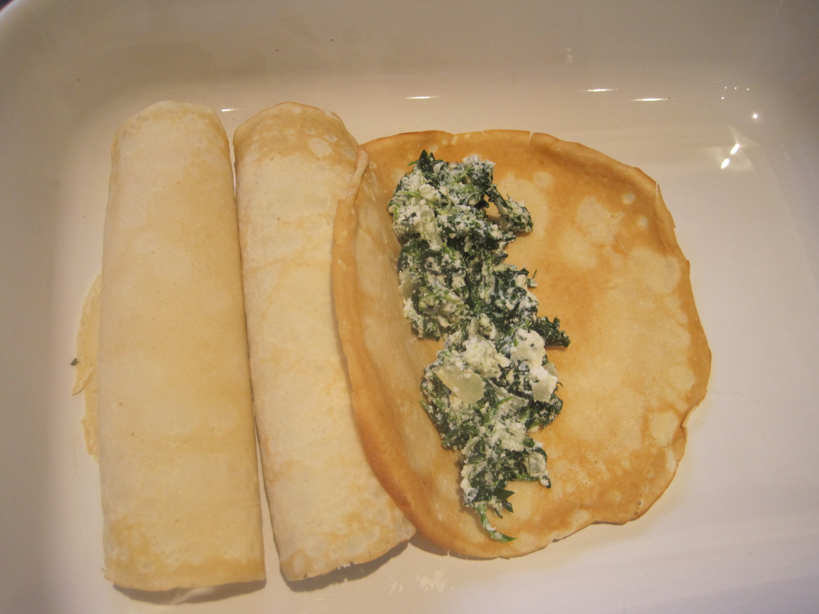 Take your defrosted pancakes and roll them up around the spinach mixture in a lasagne dish. Thusly.