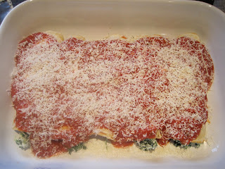 Top with lots of parmesan - I should have used more than this, but we ran out. And bake at 350F for half an hour or until it's bubbling.
