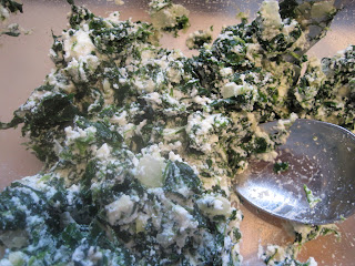 Defrost a packet of frozen spinach in the microwave. Squeeze it out in a clean teatowel to get rid of the excess water. Chop a small onion (or half a large one) as finely as you have the patience for, and sautee it until it's very soft. Add a crushed clove (or two) of garlic for the final couple of minutes. Now break up the spinach in a bowl using a fork, add the onion and garlic, and mix in about a cup of ricotta cheese. (I think it was a cup. About the same amount as there is spinach, anyway.) Season with salt, pepper, and a good grating of fresh nutmeg.
