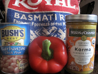 The korma isn't remotely spicy - sometimes I use the Tikka Masala version, which has a tiny bit more spice to it and might profit from a blob of plain yogurt on top. If I'm really lazy/out of food, I just use the garbanzos and the sauce, and maybe some frozen peas to green it up. Then it only does two servings, but with the chicken and the pepper there's (almost) enough for four in here.