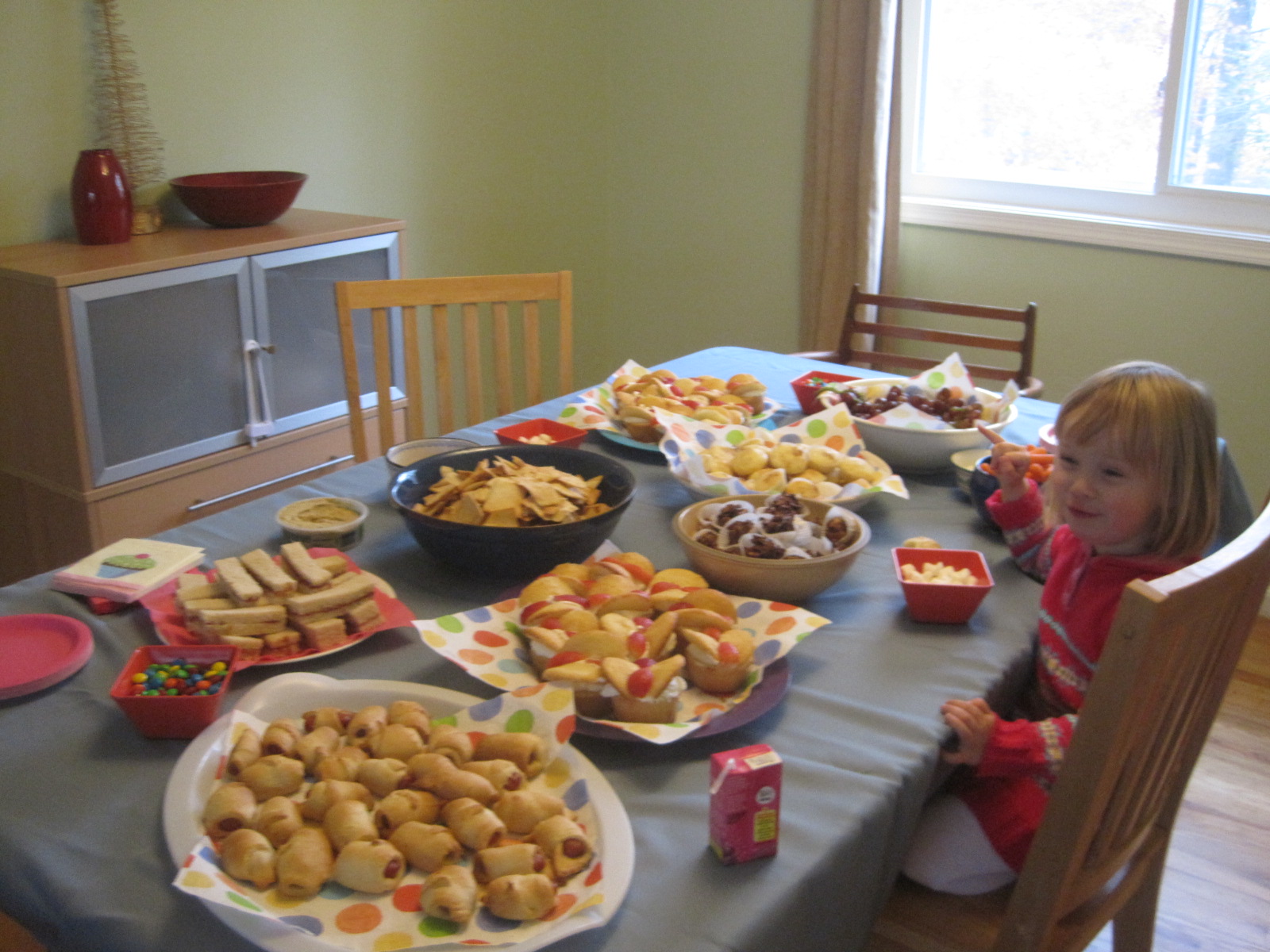 This was the finished spread, just before it was dismantled. We have pigs in blankets (mini-sausages wrapped in Pillsbury crescent roll dough), peanut-butter-and-jelly fingers, butterfly buns, pita chips, chocolate cornflake buns (melted Mars Bar [Milky Way in the US] mixed with cornflakes - another classic with a twist from Nigella), lemon ricotta muffins, grapes, and - last-minute gotta-hava-vegetable: baby carrots. Also present: hummus, salsa, ranch dip, M&Ms, mini marshmallows.