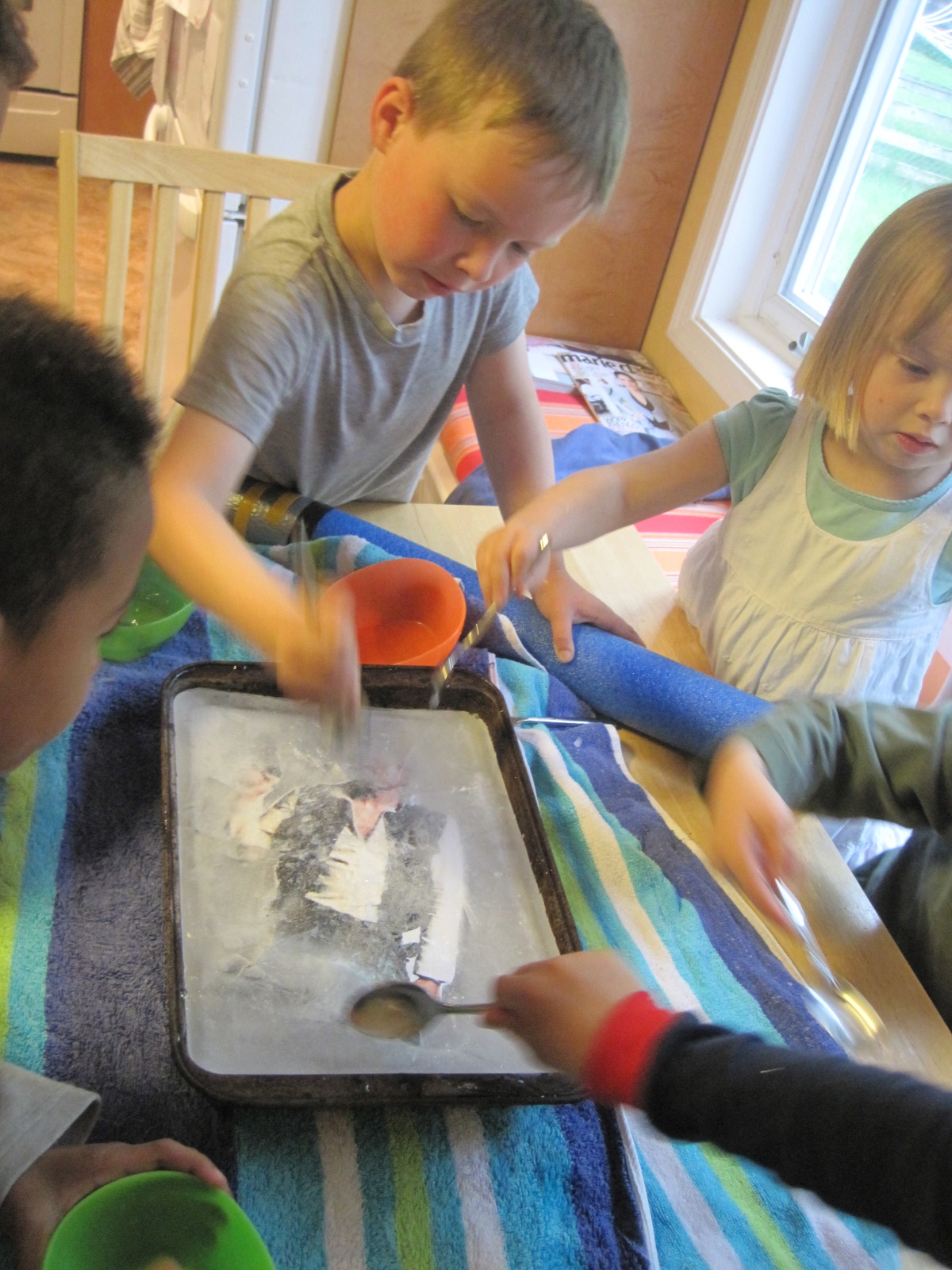Next, they had to free Han Solo. I printed a picture of the lovely Han, laminated him with clear packing tape, and froze him in ice in a baking pan. (Don't forget to start this one a couple of days before the party. Freeze a layer of water first, then put in your laminated picture, then one or two more layers on top.) We could see him, but not too clearly, which I thought was just right.